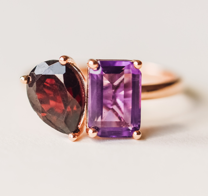 Toi et Moi is an exquisite ring that features a stunning combination of 9X6MM Amethyst and 9X7MM Garnet gemstones set in 14kt Rose Gold. This timeless design with beautiful gemstones will add a touch of romance and sophistication to any outfit.
